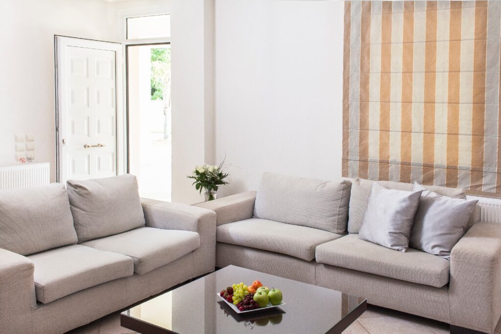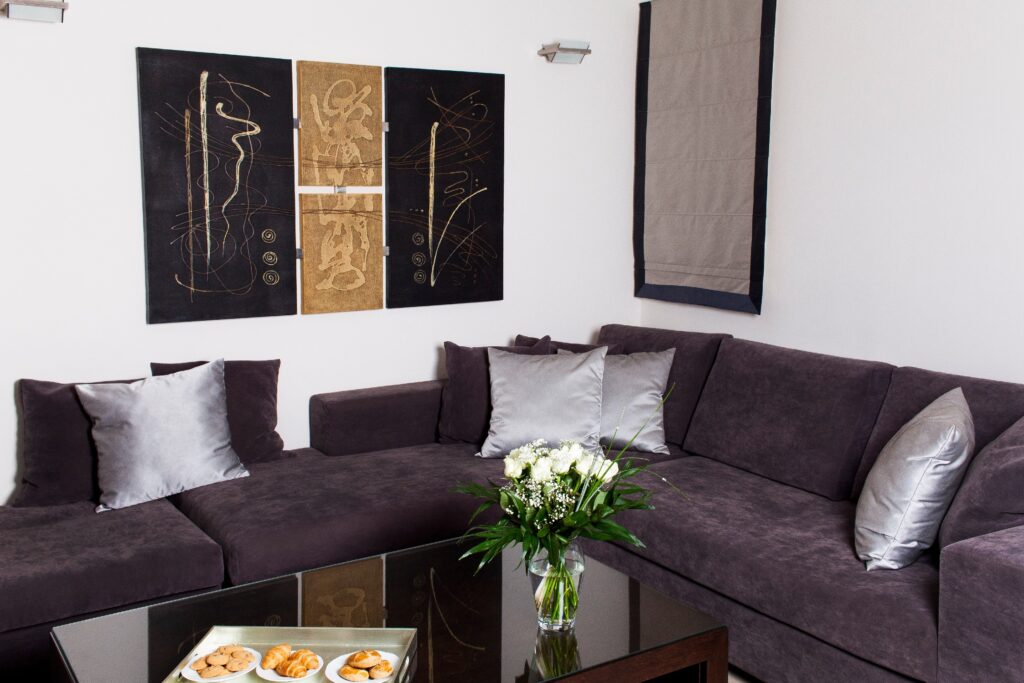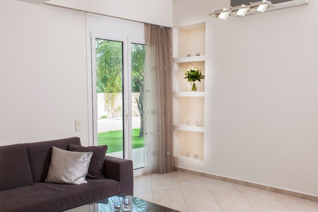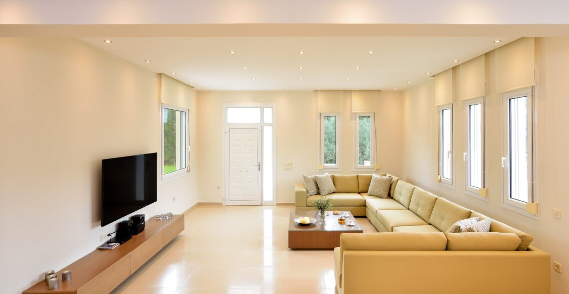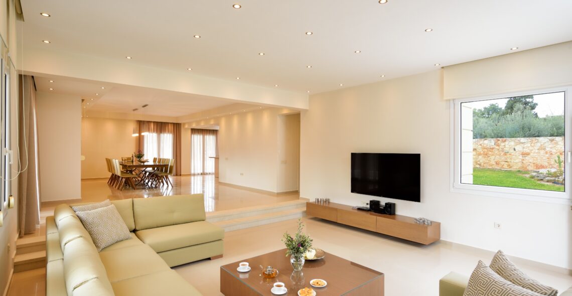 -Living room. The living room consists of a large sofa, granite floor, 50 ‘plasma TV, air conditioning.