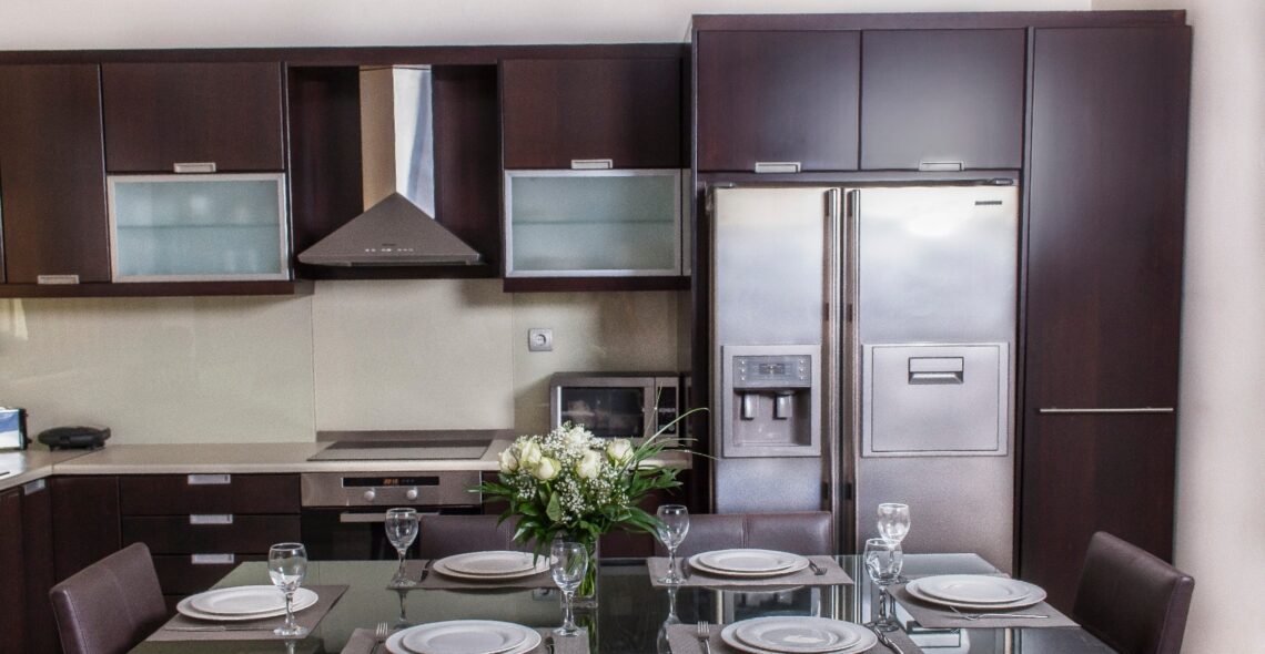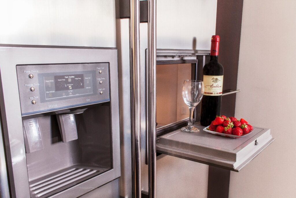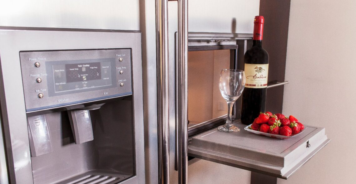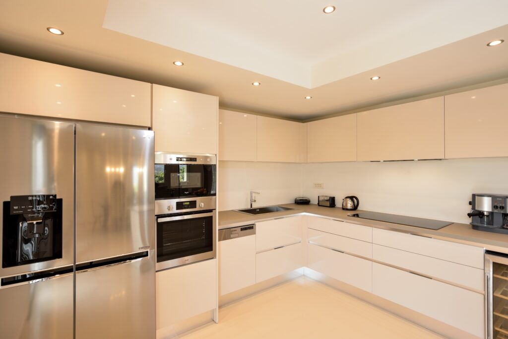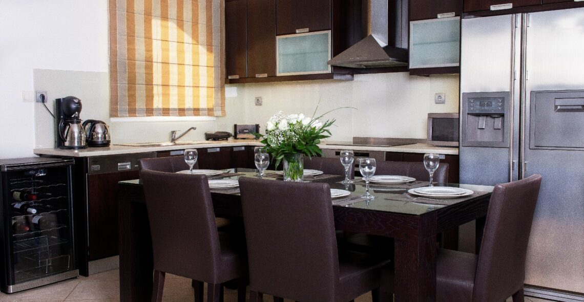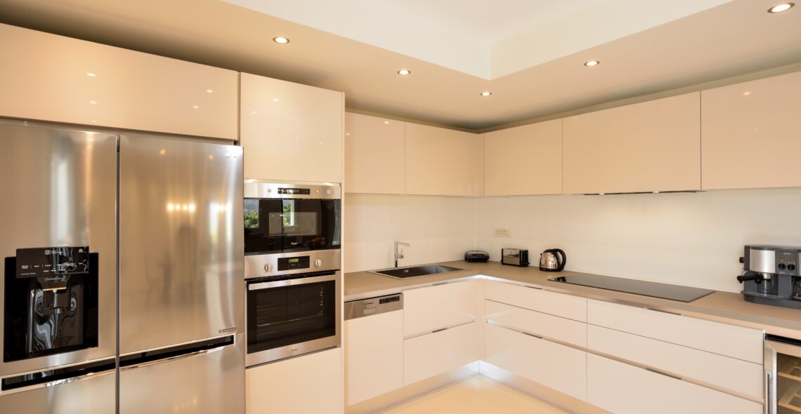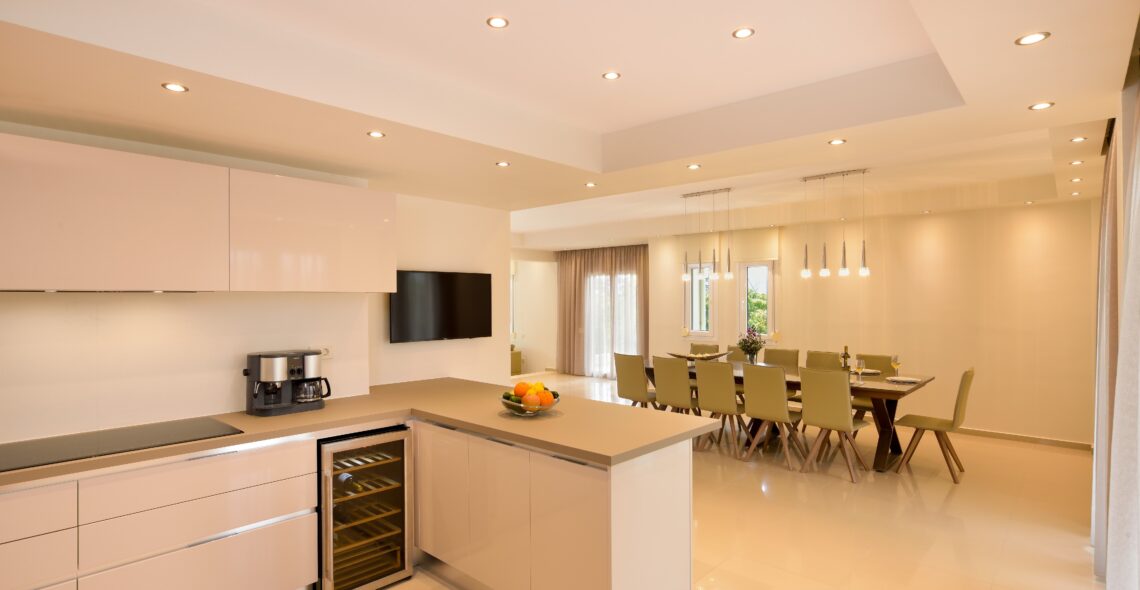 -Kitchen. The kitchen is fully equipped with cupboards, refrigerator with water and ice, kitchen with ceramic hob, oven, microwave oven, dishwasher (all built in), filter coffee maker and espresso maker, wine preserver and full household equipment for 14 persons .