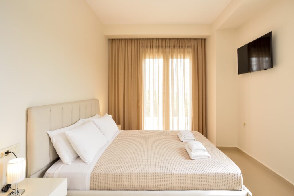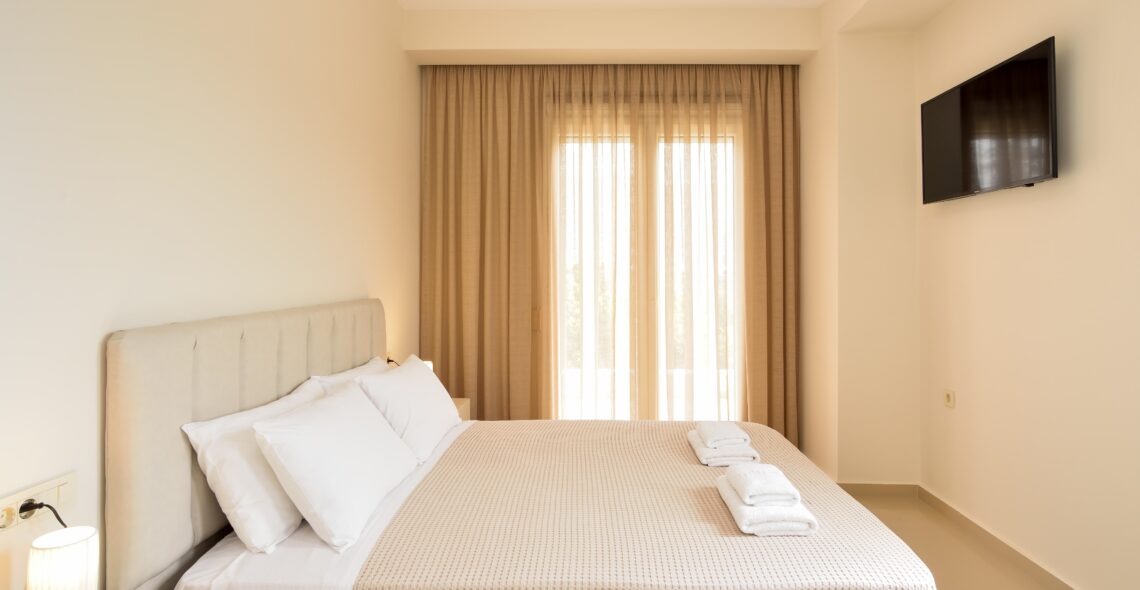 -Bedroom. The bedroom consists of a double bed, a bedside table, a quadruple closet, a plasma TV and air conditioning.