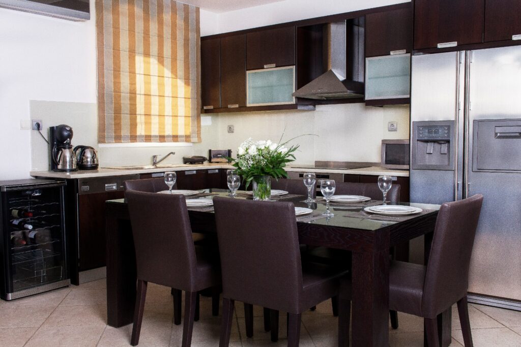 The kitchen is fully equipped with a fridge that provides water and ice, ceramic hob, oven, microwave, dishwasher, coffee maker, toaster, toaster, wine preserver and all the necessary home appliances for 6 people. Dining room for 6 people.