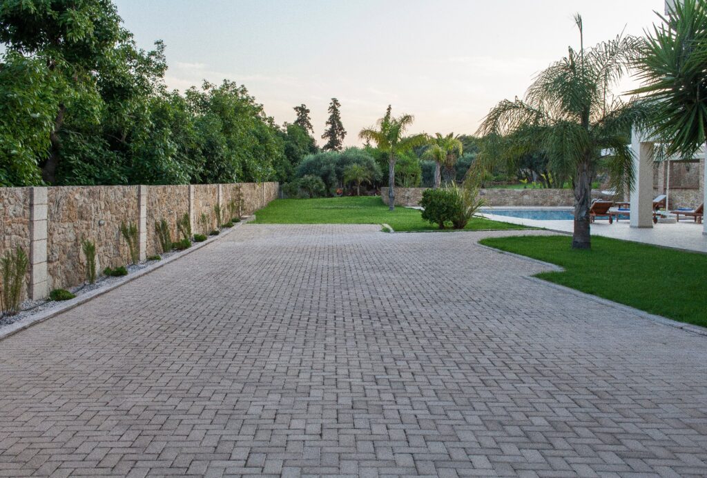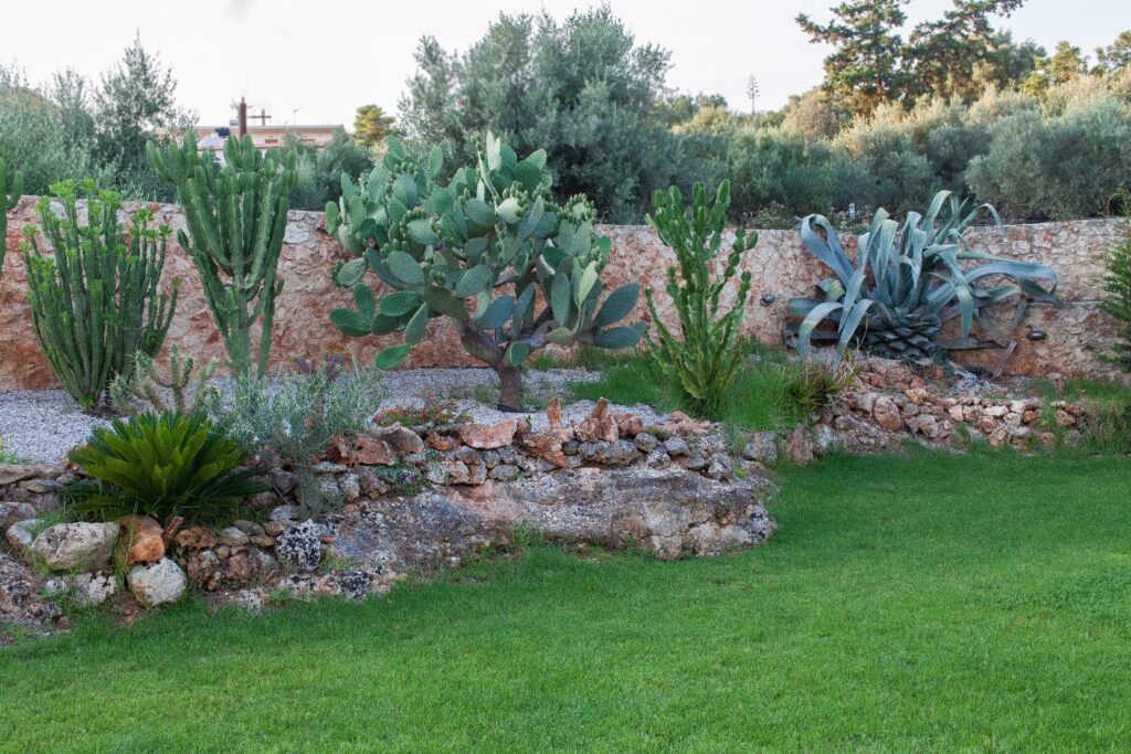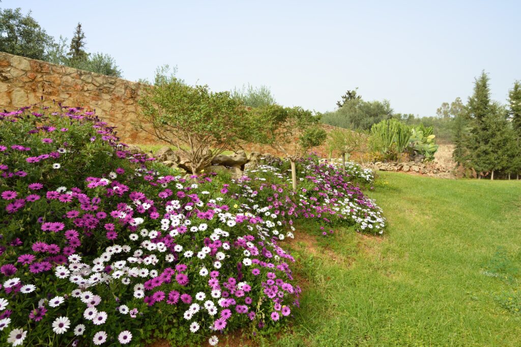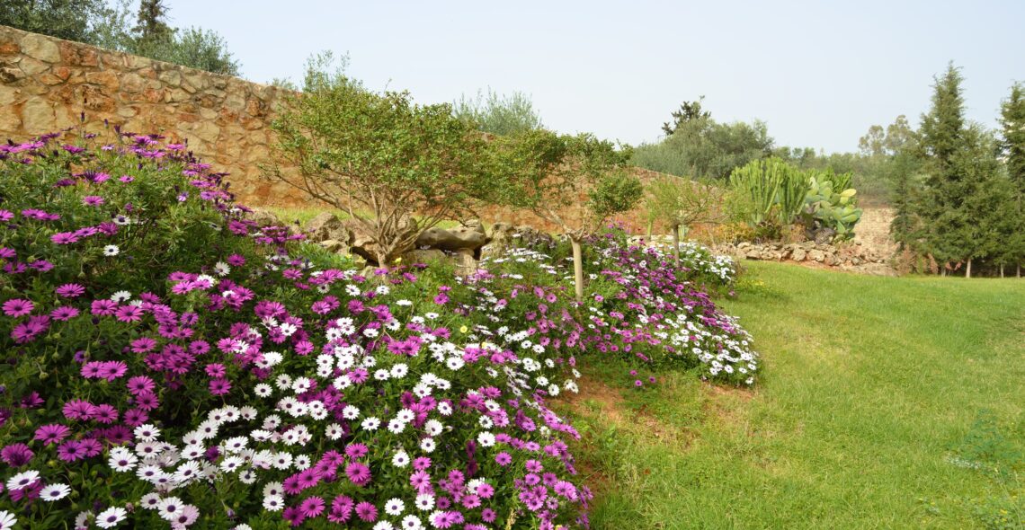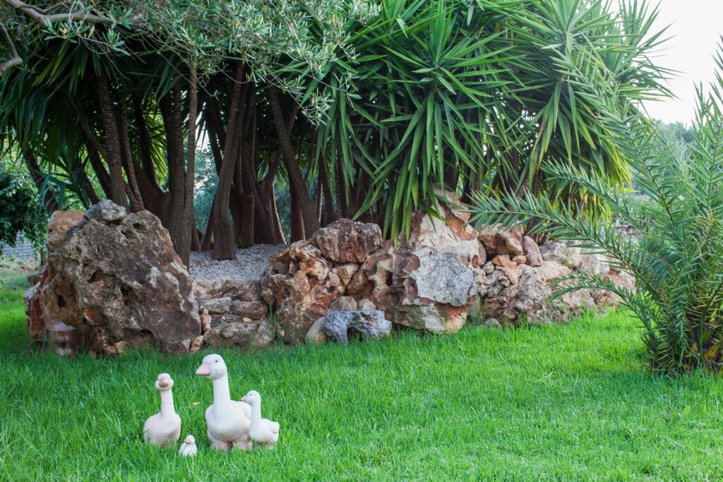 Garden: 4,000 m² garden with lawn, palm trees, cypress trees, rock gardens, flower arrangements.